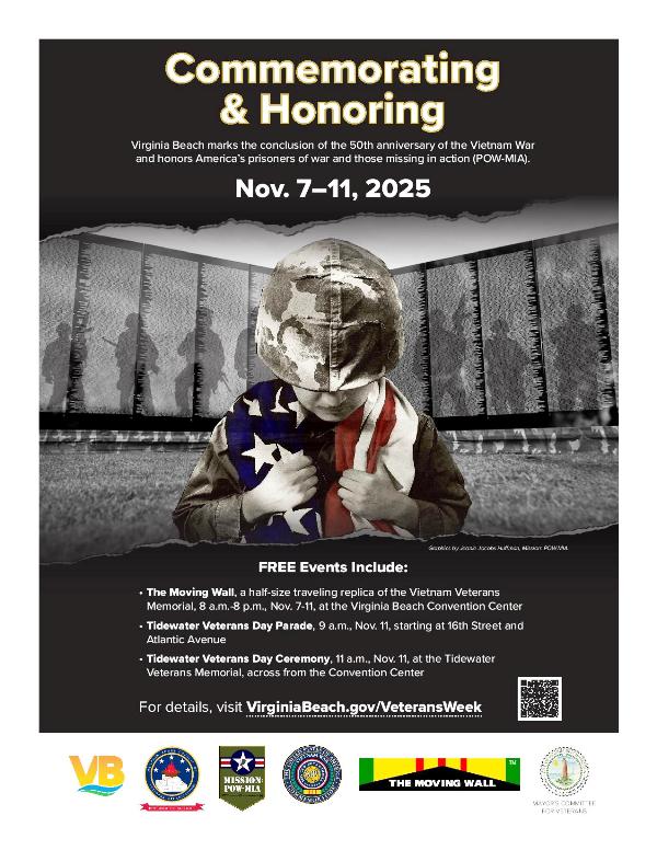 In honor of the 50th anniversary of the end of the Vietnam War, the City of Virginia Beach is hosting a number of Veteran related events from November 7th - 11th. While each will be detailed below, to see the City's webpage detailing them all, click here.
