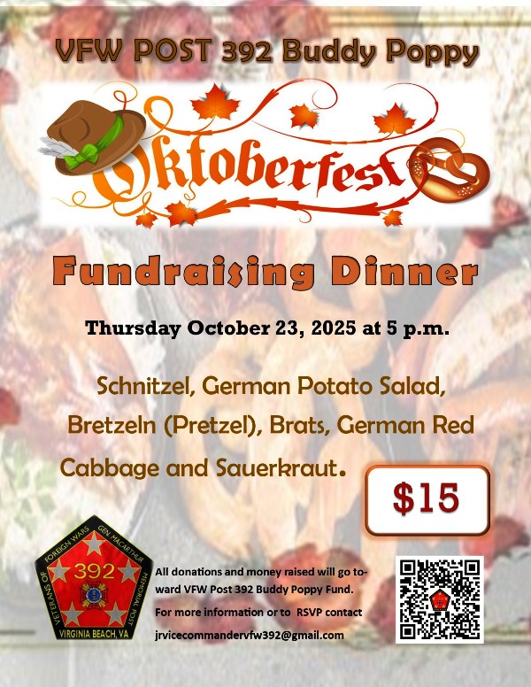 FUNDRAISING DINNER Thursday, October 23rd, 1700-1900 VFW Post 392 will hold a Buddy Poppy Fundraising Dinner on Thursday,