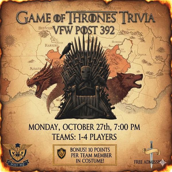 Please join us on October 27th for our monthly FREE Trivia Night at Post 392. If you want to play Trivia, you can play with a team of up to 4 members, or by yourself, but be sure to be ready for the challenge!! We've been averaging 8-10 teams, but there's room for more. The Trivia subject for September will be the "Game of Thrones" TV series. Bonus points awarded for dressing in a costume outfit from the series. A $25 Gift Certificate is awarded for 1st and a $15 Gift Certificate awarded for 2nd Place (good for food and non-alcoholic beverages only). We've been having a blast every month, so we hope to see you there!