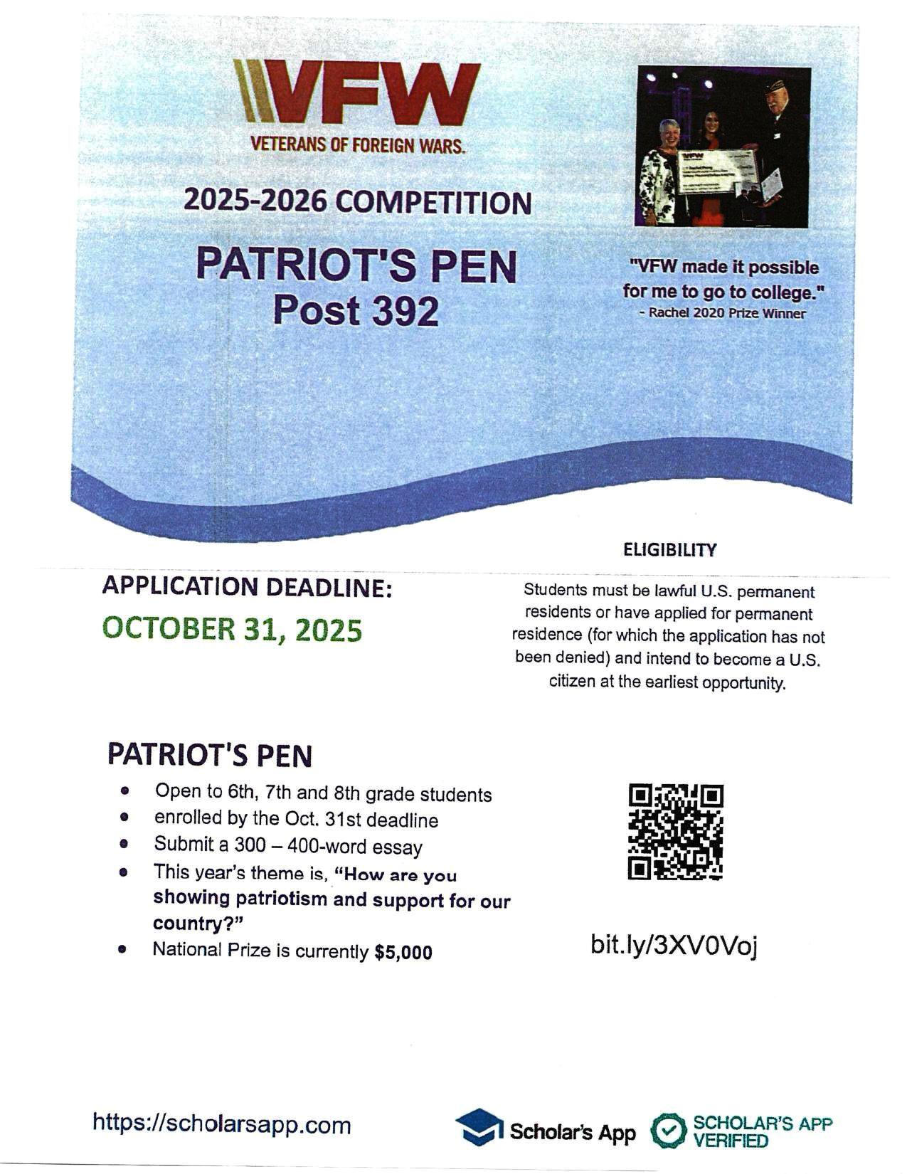 Also, scroll down to see this year's VFW Post 392 Patriot's Pen, Voice of Democracy, and Teacher of the Year winners, as well as the National winners for 2024!